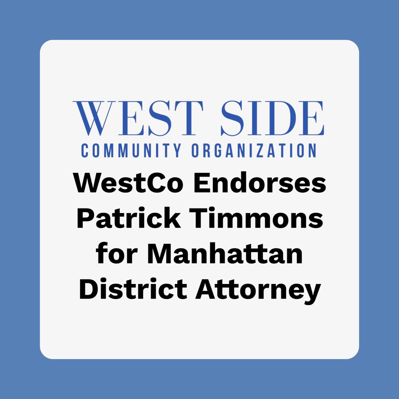 WestCo proudly endorses Patrick Timmons in the upcoming Democratic primary for Manhattan DA.